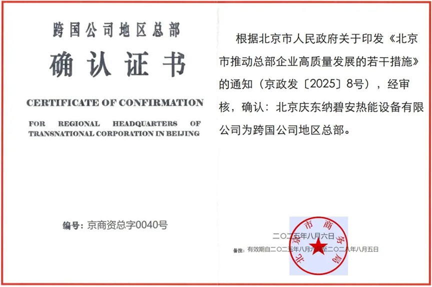 此次認(rèn)證嚴(yán)格依據(jù)《北京市人民政府關(guān)于印發(fā)〈北京市推動總部企業(yè)高質(zhì)量發(fā)展的若干措施〉的通知》(京政發(fā)〔2025〕8號)相關(guān)規(guī)定,由北京市商務(wù)局權(quán)威頒發(fā)。它不僅是對慶東納碧安在京運營規(guī)模、經(jīng)濟貢獻(xiàn)及戰(zhàn)略地位的高度認(rèn)可,更是公司全球化發(fā)展征程上的又一重要里程碑。